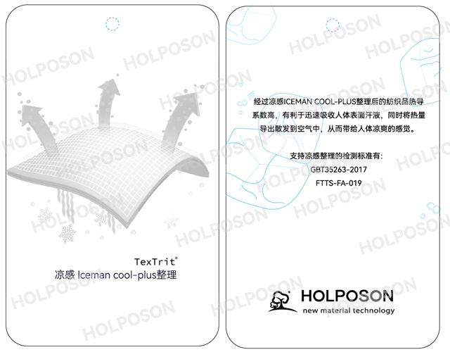 Textrit® Iceman COOL-PLUS 是本公司以超细云母粉为主,并运用萃取技术,经科学精心开发研制的纺织品用后整理剂。它能提高织物的热导系数,迅速吸收人体表面汗液,同时将热量导出散发到空气中,从而带给人体凉爽的感觉。本产品还具有一定的防紫外线效果。主要适用于内衣面料、衬衫面料、床上用品面料、登山服、高尔夫服装、休闲系列服装面料、各种服饰面料、家用纺织品面料等。