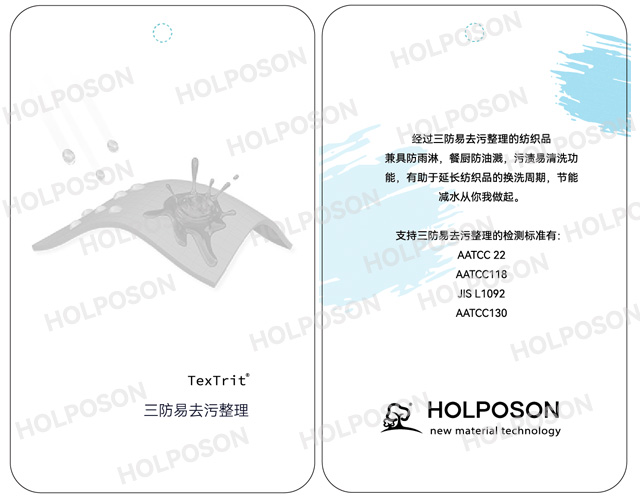 Textrit® Smart Clean-T 亲水易去污整理剂 Textrit® Smart Clean-T 是经过特殊改性聚酯类亲水易去污整理剂,能够赋予加工织物良好的亲水,抗静电,吸湿速干,蓬润性等性能,且耐洗性达50次以上(JIS L0217. 103法,连续洗涤法)经过易去污整理后的纺织品面料,在一定程度上可以清水擦除所沾污渍,如:酱油,番茄酱,玉米油,圆珠笔油污等。满足家庭主妇对浅色衣物易打理易清洁的要求。使难去除、易残留的脏污,可以去除干净,达到污所不落,节能去污。Textrit® Smart Clean-T 适用于天然纤维、合成纤维及其混纺织物,目前易去污整理可用于开发浅色系列的童装面料,羽绒服面料,沙发面料,工装,职业装,衬衫,白T恤等等。
