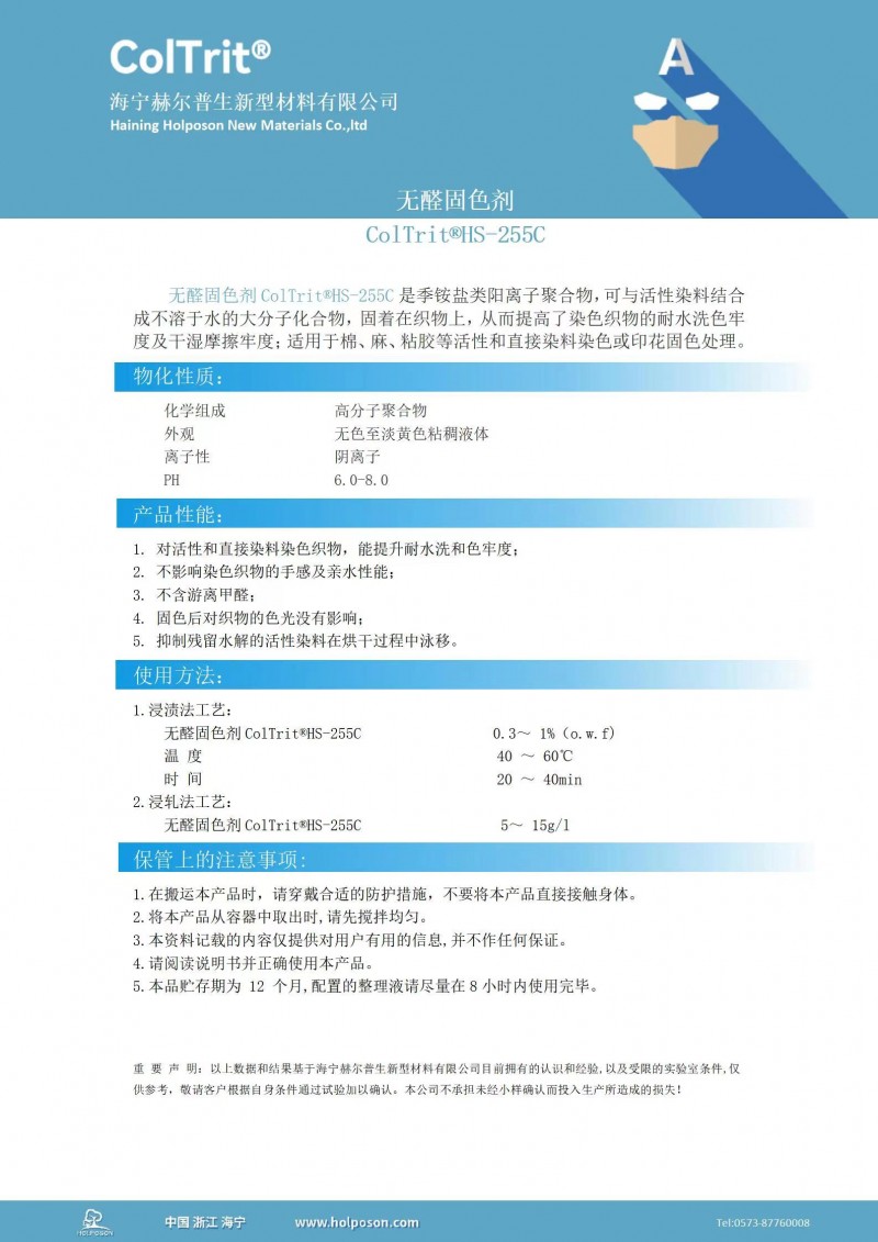 无醛固色剂ColTrit® HS-255C是季铵盐类阳离子聚合物,可与活性染料结合成不溶于水的大分子化合物,固着在织物上,从而提高了染色织物的耐水洗色牢度及干湿摩擦牢度;适用于棉、麻、粘胶等活性和直接染料染色或印花固色处理。